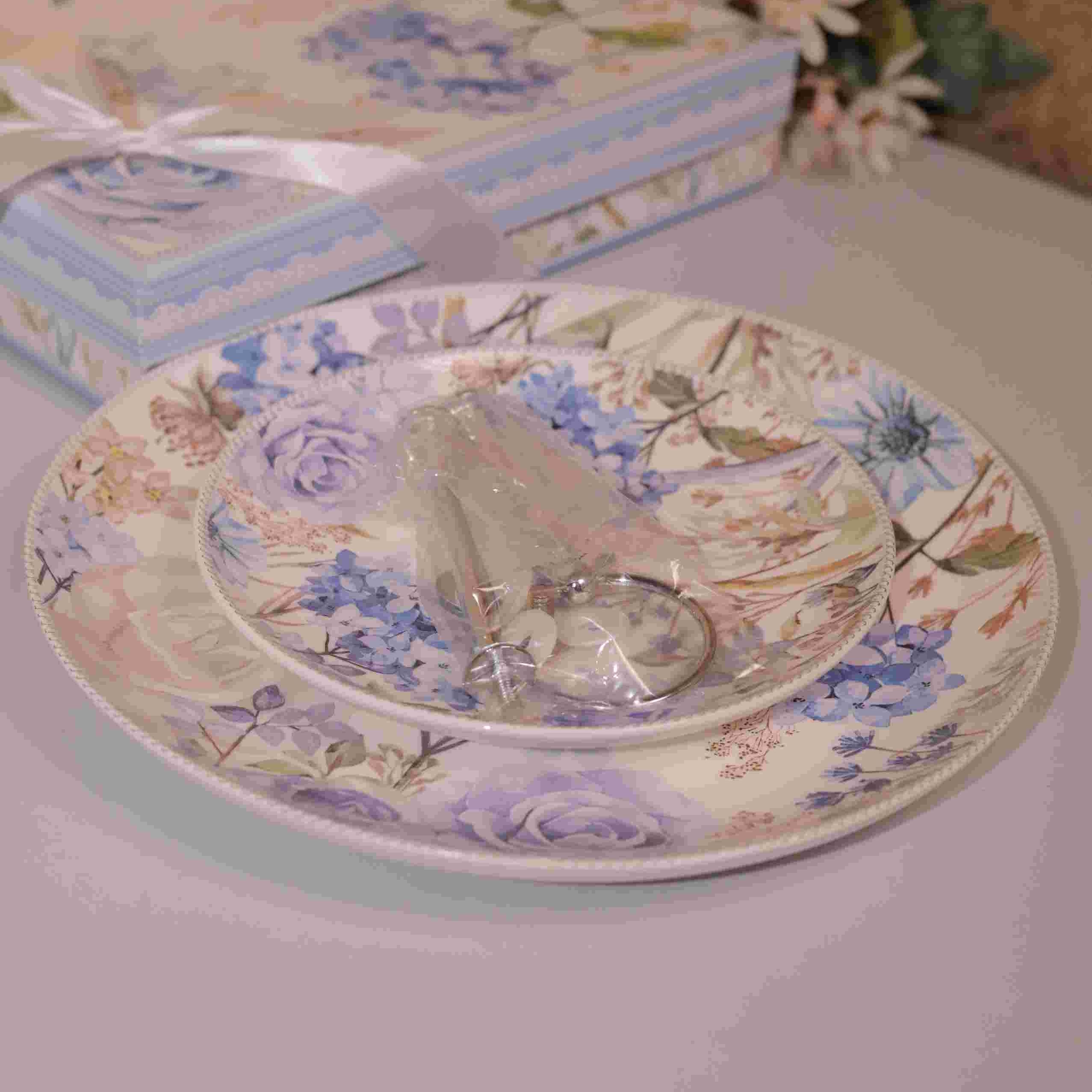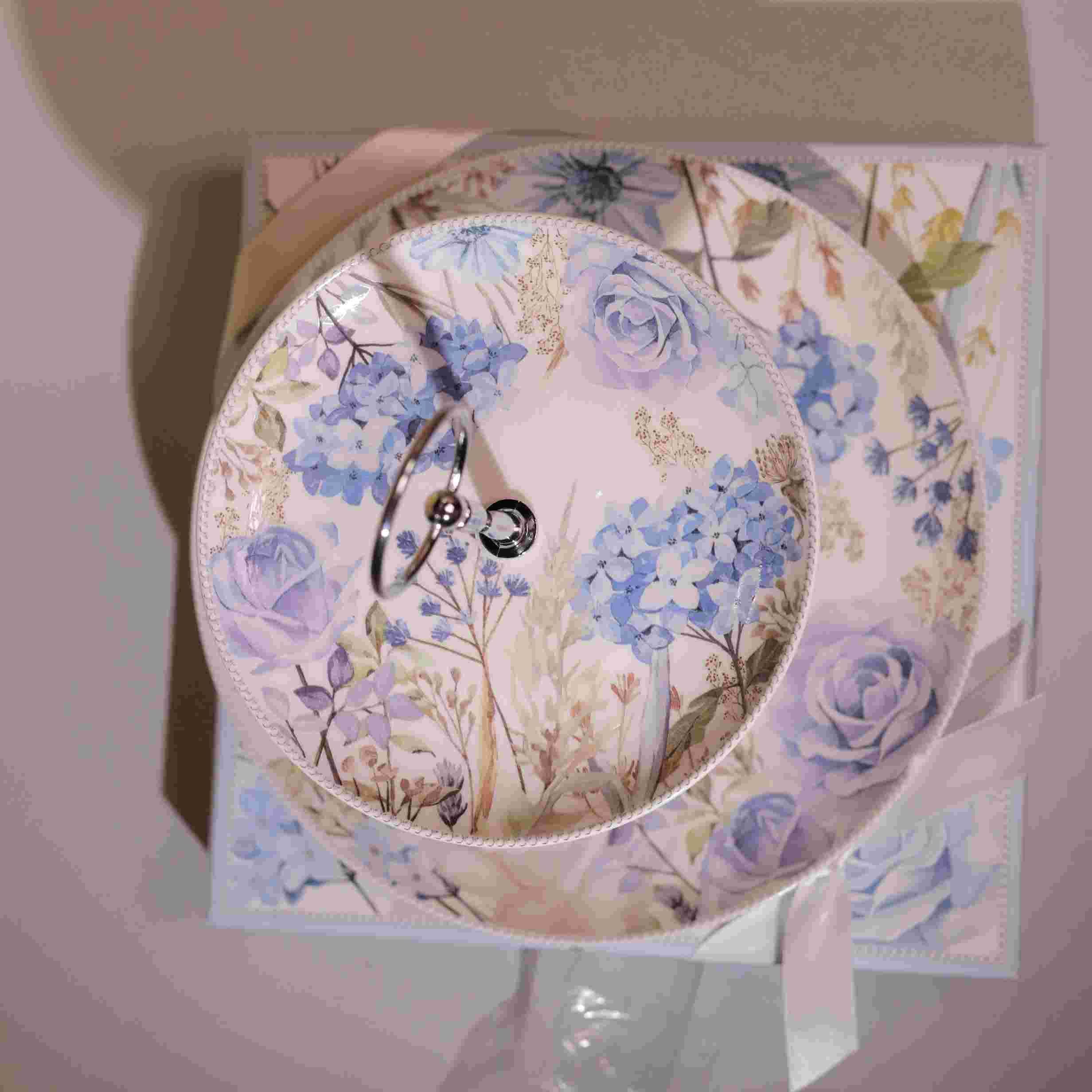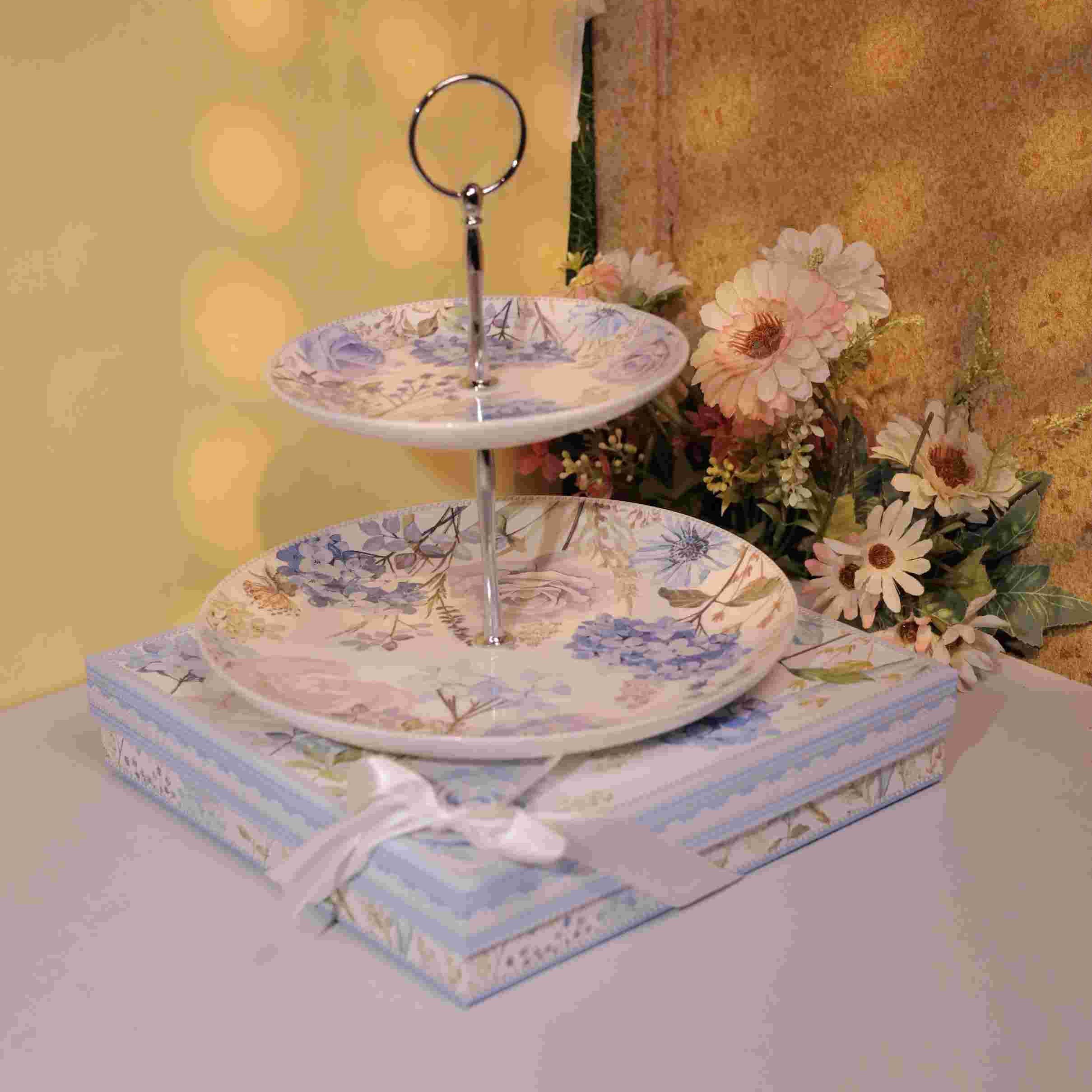 This charming 2-tier ceramic stand features soft blue floral designs that add elegance to any setting. It includes a strong silver handle for easy carrying and comes packed in a beautiful matching gift box with ribbon.