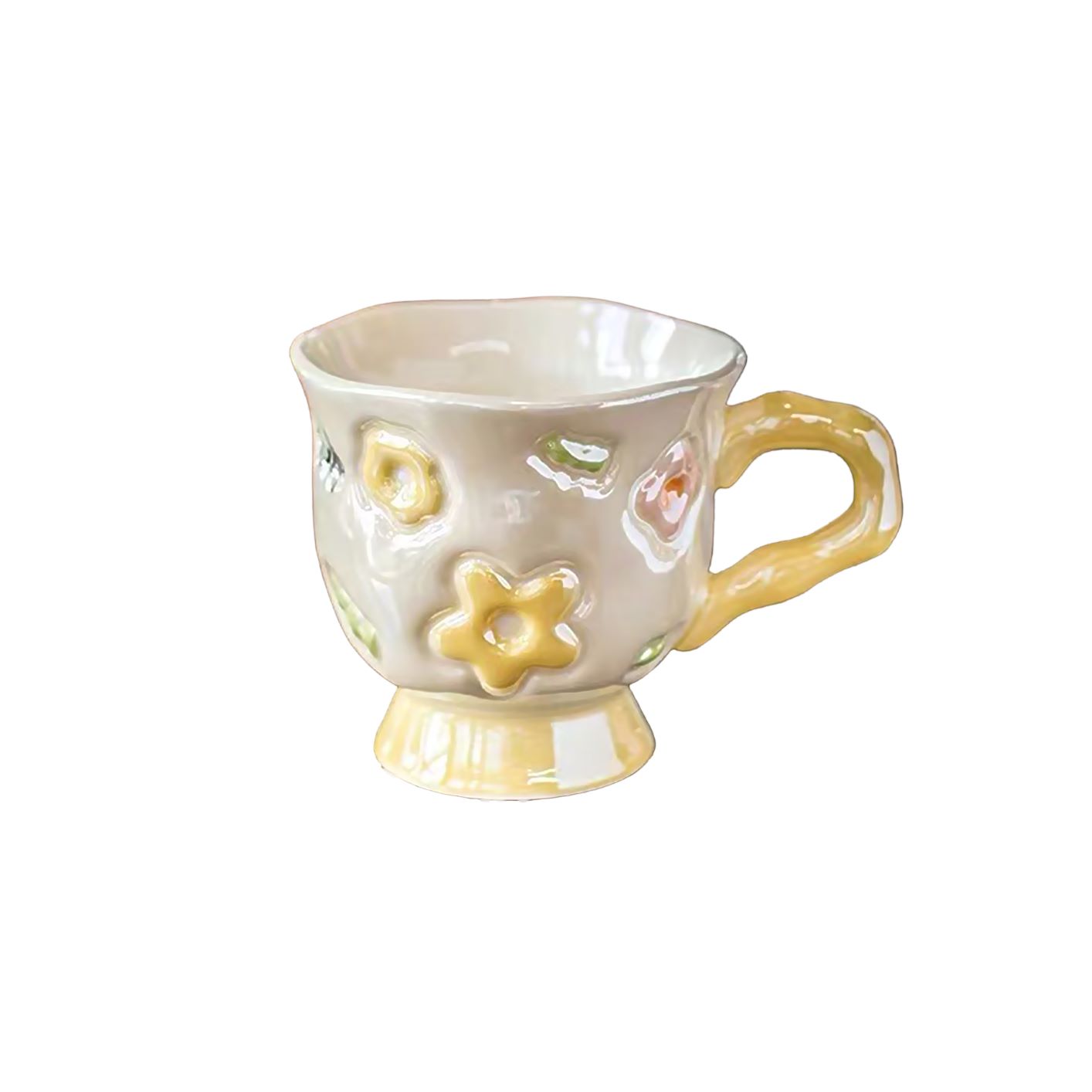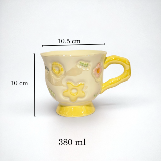 Add charm to your tea time with this beautifully crafted ceramic mug in a soothing color tones. Featuring playful embossed floral designs and a uniquely curved handle, this mug blends vintage aesthetics with modern whimsy. Perfect for coffee, tea, or your favorite hot beverage.