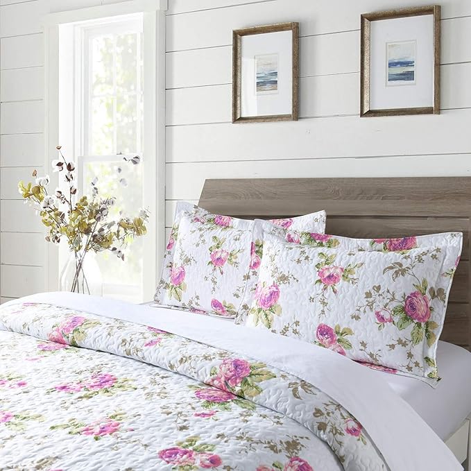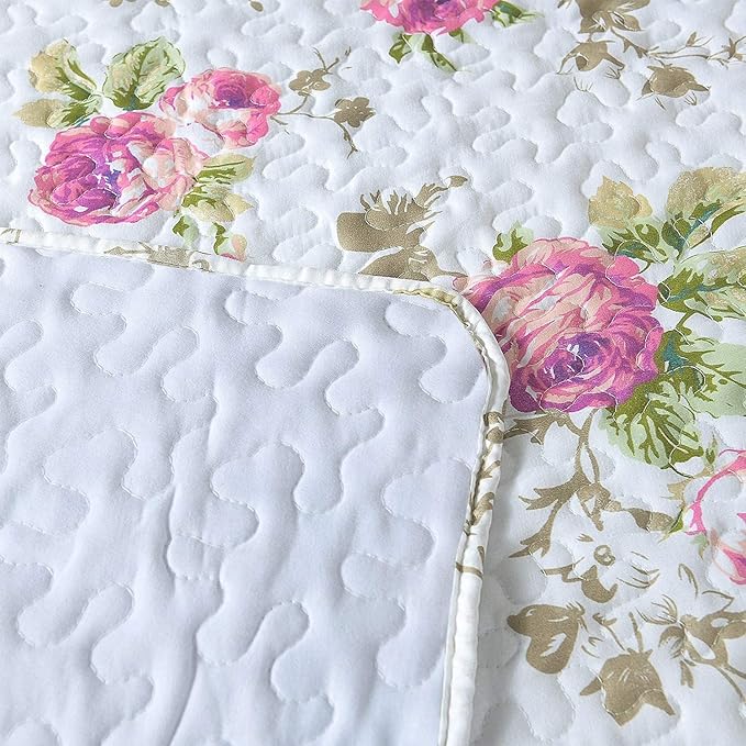 King Size Quilt Set, 3-Piece Lightweight Soft Bedspread Coverlet (104×90 in) with 2 Pillow Shams (20×36 in) for All Season,Rose Floral Print